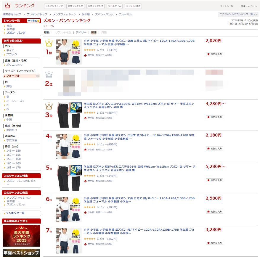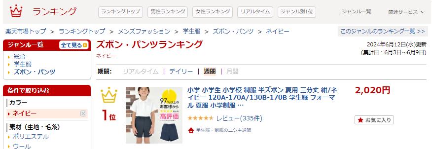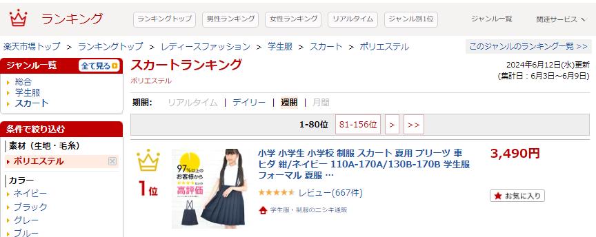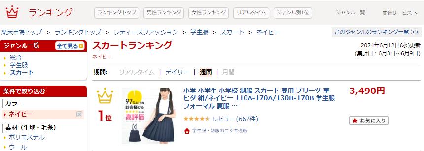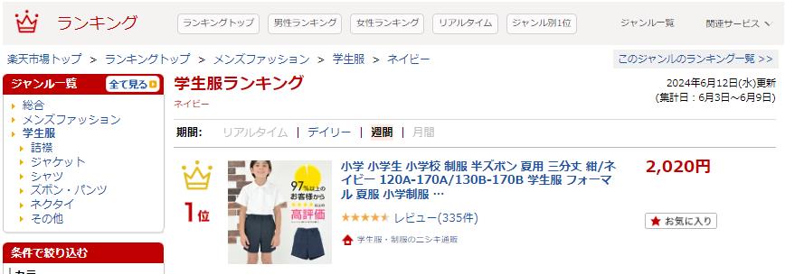 (集計日:6月3日~6月9日)楽天週間ランキングで、株式会社ニシキの商品が1位となりましたので、記録用にこちらに掲載します。「学生服・制服のニシキ通販」