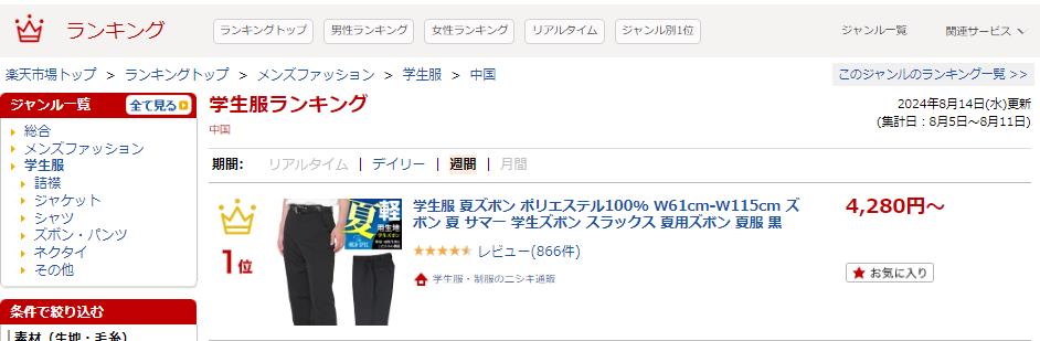 ランキングトップ > メンズファッション > 学生服 > 中国