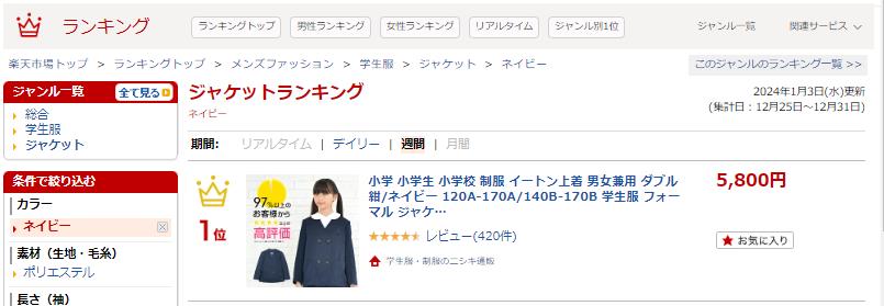 楽天の週間ランキングで、株式会社ニシキの商品が1位に輝きましたので、記録用にこちらに記載します。「学生服・制服のニシキ通販」