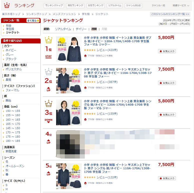 楽天週間ランキングで、株式会社ニシキの商品が堂々の1位を達成しましたので、記録用にこちらに掲載します。「学生服・制服のニシキ通販」