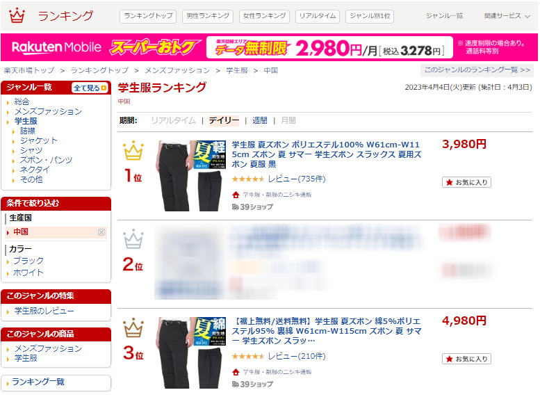楽天市場トップ > ランキングトップ > メンズファッション > 学生服 > 中国