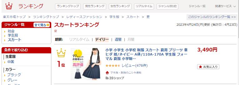 ランキングトップ > レディースファッション > 学生服 > スカート