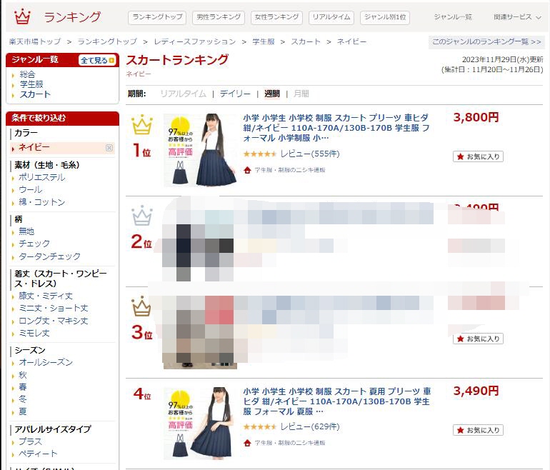 ランキングトップ > レディースファッション > 学生服 > スカート